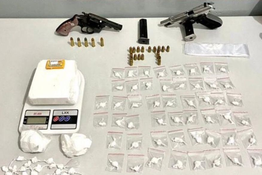 Um dos suspeitos foi detido. Foram apreendidas duas armas de fogo, sendo uma pistola e um revólver calibre .38, além de grande quantidade de substância análoga a cocaína.