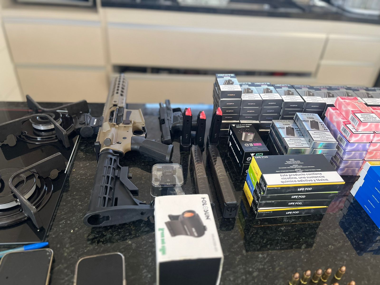 No cumprimento das medidas, o proprietário foi preso em flagrante pelo crime de contrabando (art 334 – A do Código Penal), tendo sido apreendidas várias unidades de cigarro eletrônico. Foi também apreendido um fuzil, uma pistola e munições. O preso tem registro de CAC.