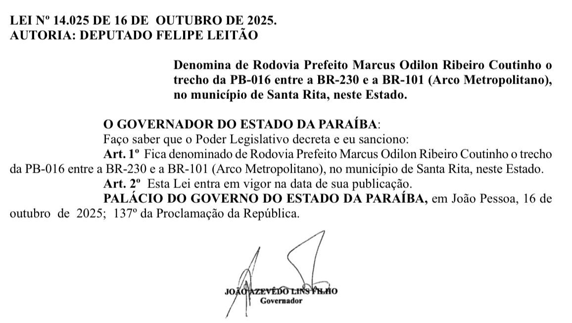 O governador João Azevêdo sancionou o Projeto de Lei que o Arco Metropolitano, que está sendo construído na PB-016, em Santa Rita, receba o nome do ex-prefeito de Santa Rita, Marcus Odilon Ribeiro Coutinho. A sanção foi publicada no Diário Oficial desta sexta-feira (17).