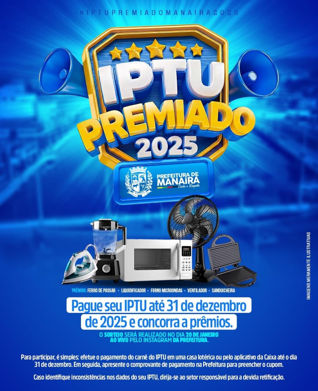 A Prefeitura de Manaíra lançou campanha do IPTU Premiado 2025 com vários prêmios. Já foi iniciada a entrega dos boletos e todos os contribuintes que realizarem o pagamento até 31 de dezembro poderão participar do sorteio de vários prêmios especiais.