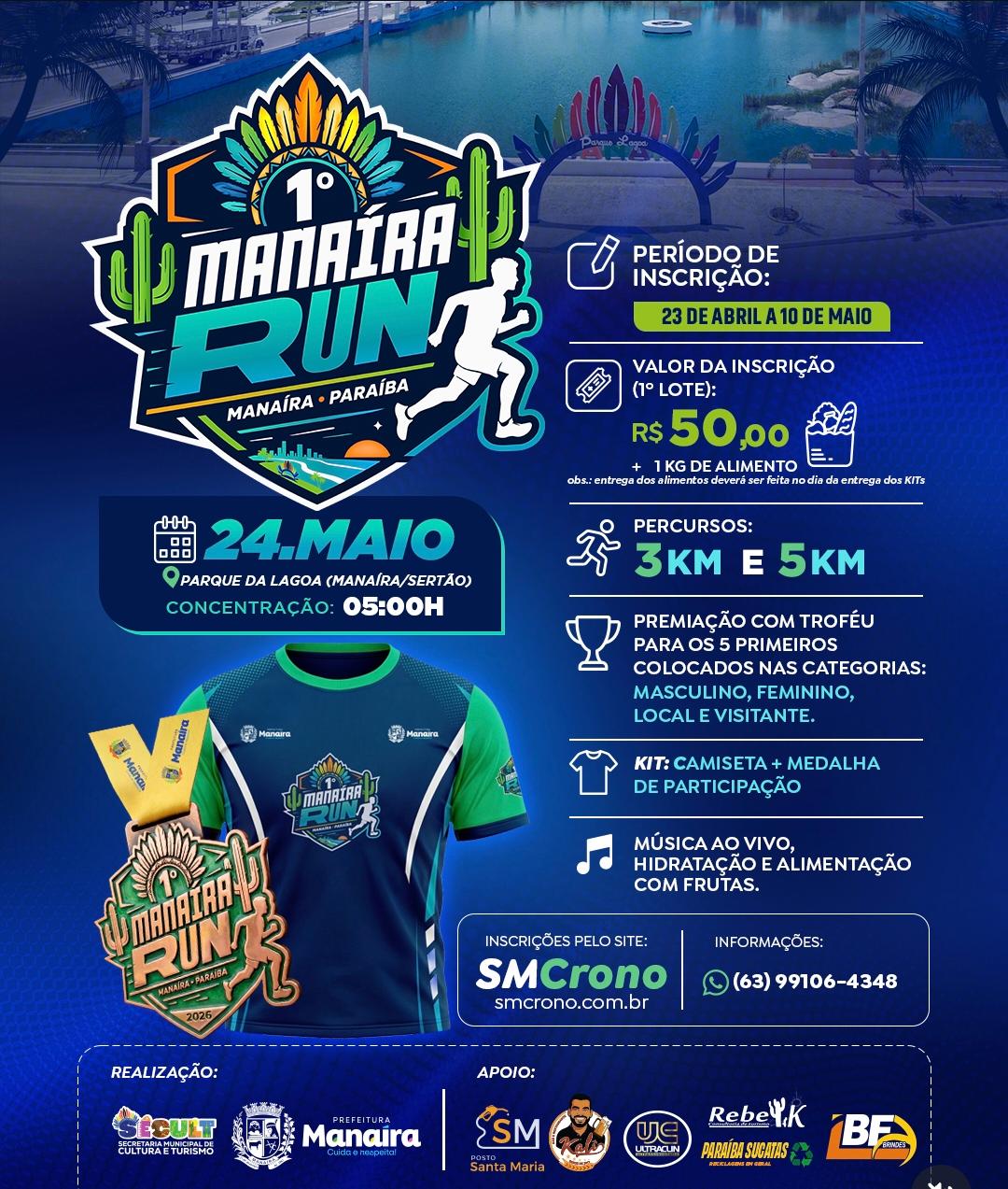 O município de Manaíra vai sediar no próximo dia 24 de maio o 1º Manaíra Run, evento esportivo que promete reunir corredores da cidade e da região. A concentração será às 5h da manhã, no Parque da Lagoa, com estrutura preparada para garantir conforto e segurança aos participantes.
